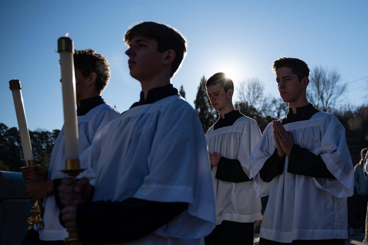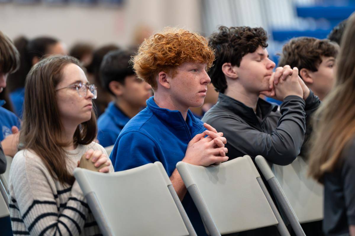 HUNTERSVILLE — Staff, students and guests braved the cold early on Dec. 12 at Christ the King High School to honor Our Lady of Guadalupe. The celebration began in front of the school with a procession to the gymnasium for Mass. Some students carried flowers as they sang songs to honor Our Lady of Guadalupe.