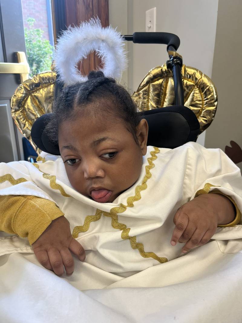 The Holy Angels, each with a custom-made costume, played a part in recreating the Nativity scene. There was a tax collector with carefully knitted bags of money on his lap, an innkeeper with a lantern in her hand, and even two little holy angels in white, a halo of garland over their heads and gold wings hanging from the back of their wheelchairs. One of those angels was Emberley the youngest resident at 18 months. Five months ago, Bishop Martin held her in his arms during his first visit to Holy Angels.