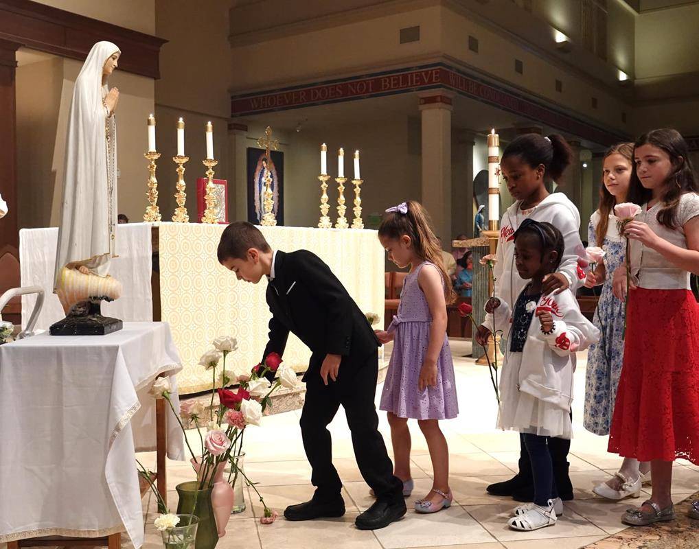 Children place flowers at Mary's feet at St. Mark Church