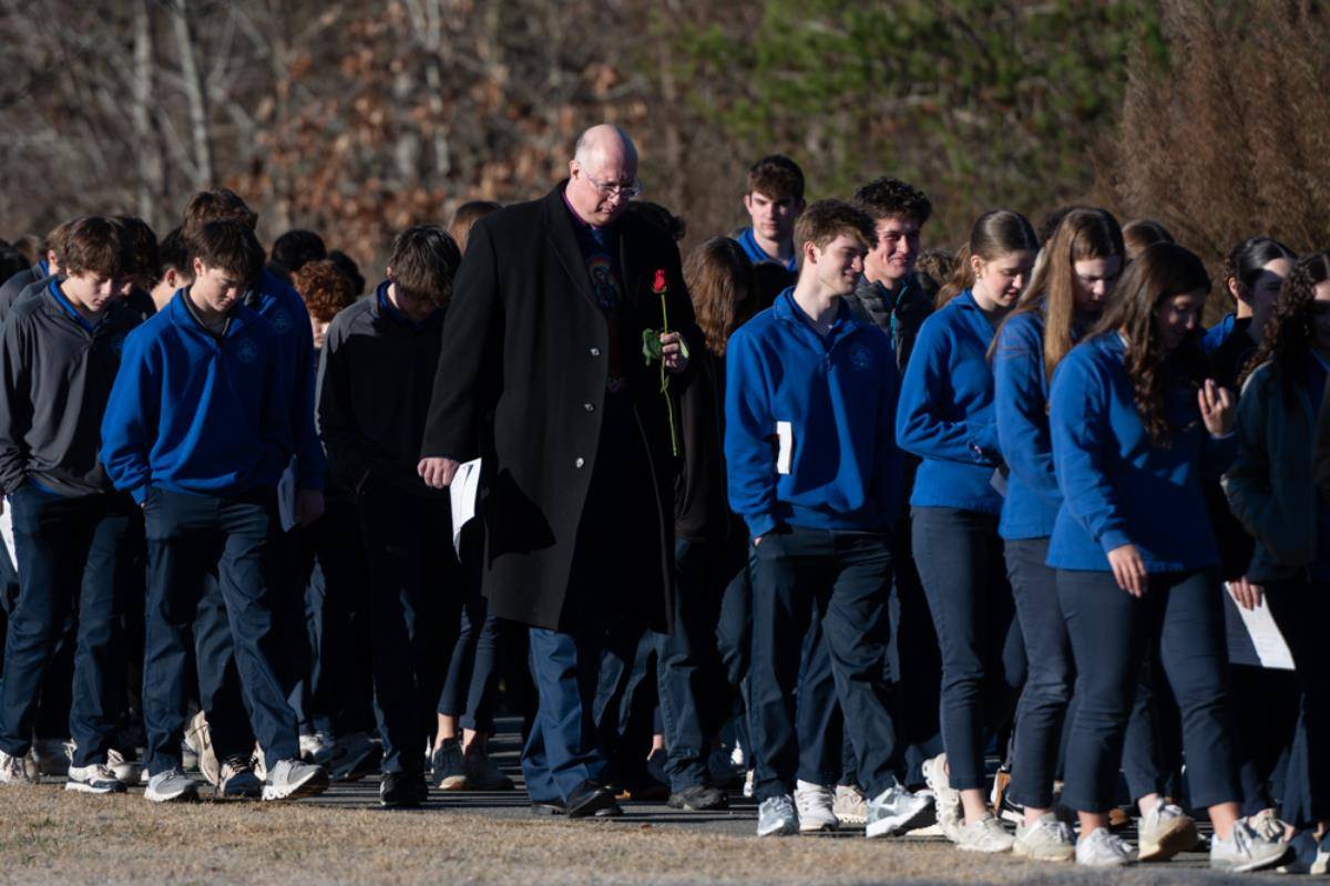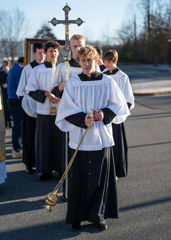 HUNTERSVILLE — Staff, students and guests braved the cold early on Dec. 12 at Christ the King High School to honor Our Lady of Guadalupe. The celebration began in front of the school with a procession to the gymnasium for Mass. Some students carried flowers as they sang songs to honor Our Lady of Guadalupe.