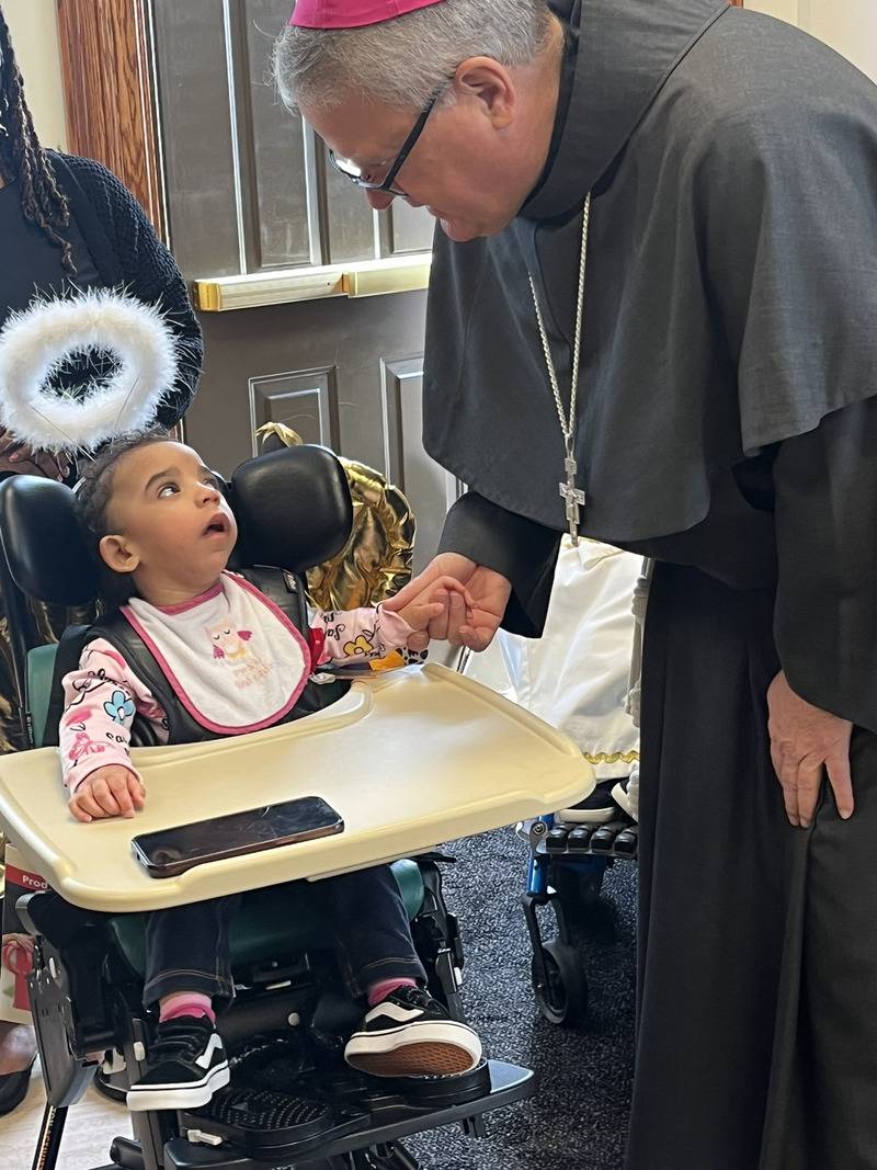 The Holy Angels, each with a custom-made costume, played a part in recreating the Nativity scene. There was a tax collector with carefully knitted bags of money on his lap, an innkeeper with a lantern in her hand, and even two little holy angels in white, a halo of garland over their heads and gold wings hanging from the back of their wheelchairs. One of those angels was Emberley the youngest resident at 18 months. Five months ago, Bishop Martin held her in his arms during his first visit to Holy Angels.